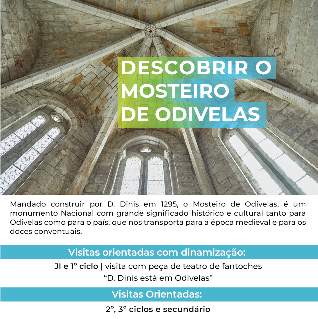Mandado construir pelo Rei D. Dinis em 1295, o Mosteiro de Odivelas é um Monumento Nacional com grande significado histórico e cultural tanto para Odivelas como para o País. Abrir as portas do Mosteiro de Odivelas ao público escolar é visitar espaços mágicos do nosso passado secular com mais de 700 anos de história, onde todos os nossos sentidos serão despertos e a curiosidade aguçada.