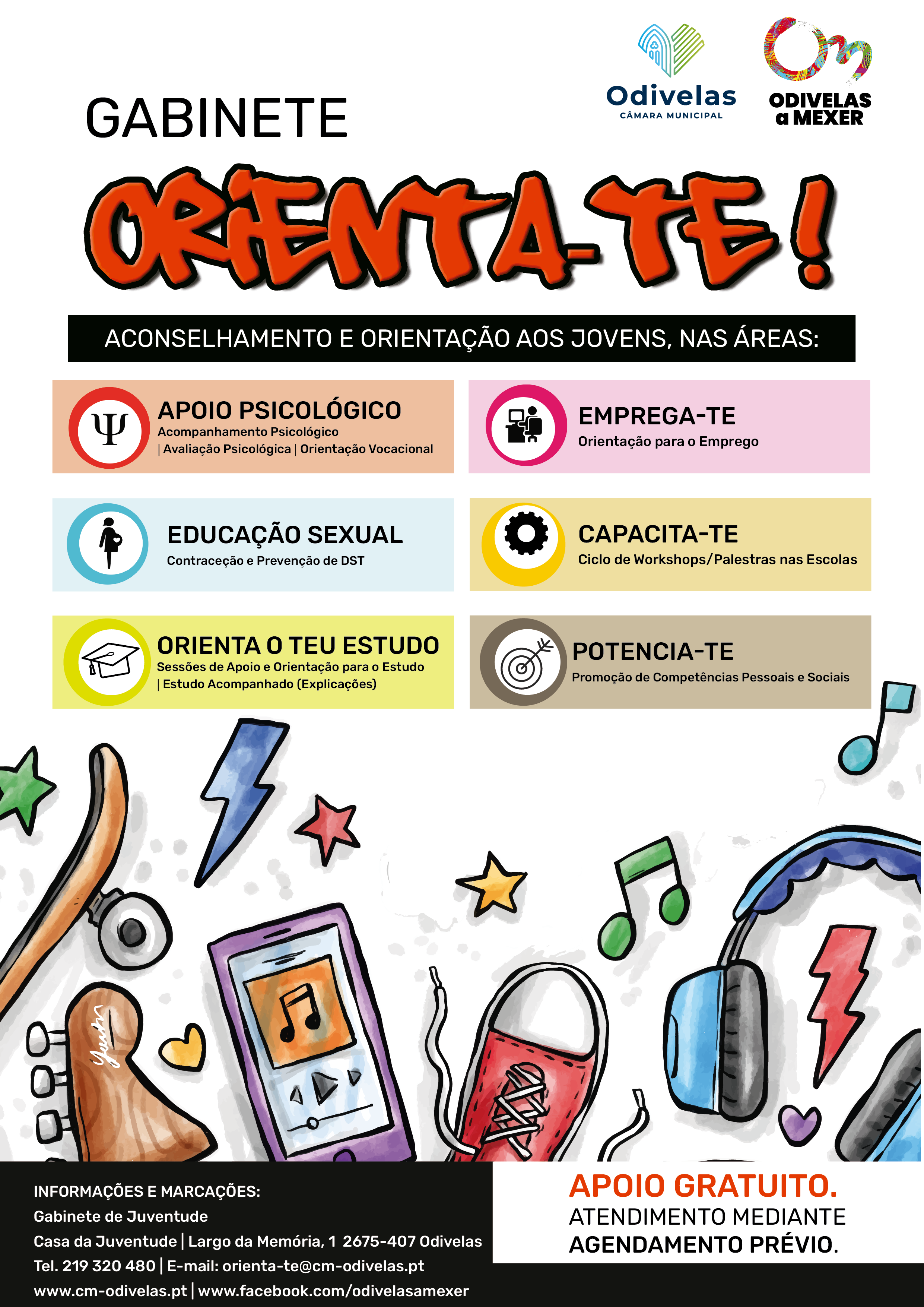 O Gabinete de Juventude da Câmara Municipal de Odivelas, no âmbito do projeto Gabinete Orienta-te!, dispõe de um serviço de apoio, aconselhamento e orientação, destinado a jovens (dos 12 aos 35 anos), residentes, estudantes ou trabalhadores no Concelho de Odivelas, nas seguintes valências:
